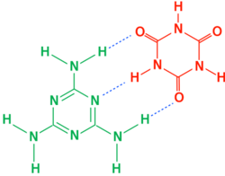 Researchers have focused on the role of melamine and related compounds in causing kidney failure. Beginning on 19 April, researchers reportedly had ruled out aminopterin contamination and had found a "spoke-like crystal" in contaminated wheat gluten and rice protein concentrate and the tissues and urine of affected animals. (It was previously known that melamine and cyanuric acid can form networks of hydrogen bonds, creating a tile-like planar structure through molecular self-assembly.)[61] The crystal has been said to serve as a biomarker for contamination and is approximately 30% melamine. The remainder has been identified as cyanuric acid, ammelide and ammeline, with crystals recovered from urine reported to be approximately 70% cyanuric acid. While some researchers have theorized the three latter chemicals might have been formed as the animals metabolized the melamine, or as byproducts of bacterial metabolism (cyanuric acid is a known intermediate byproduct of bacterial metabolism of melamine), their presence in the crystals found in contaminated protein itself, combined with media reports of widespread adulteration with both melamine and cyanuric acid in China, has focused research efforts on their combined effects in animals. Neither melamine nor cyanuric acid, a chemical commonly used in pool chlorination, have been thought to be particularly toxic by themselves. The current hypothesis is, although these contaminants are not very toxic individually, their potency appears to be increased when they are present together.[62][63][64][65][66]