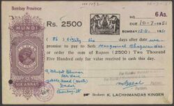 A hundi for Rs 2500 of 1951, stamped in the Bombay Province with a pre-printed revenue stamp.