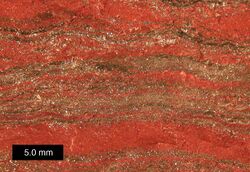 Iron formations must be at least 15% iron in composition, just like ironstones and all iron-rich sedimentary rocks. However, iron formations are mainly Precambrian in age which means that they are 4600 to 590 million years old. They are much older than ironstones. They tend to be cherty, though chert can not be used as a way to classify iron formations because it is a common component in many types of rocks. They are well banded and the banding can be anywhere from a few millimeters to tens of meters thick. The layers have very distinct banded successions that are made up of iron rich layers that alternate with layers of chert. Iron formations are often associates with dolomite, quartz-rich sandstone, and black shale. They sometimes grade locally into chert or dolomite. They can have many different textures that resemble limestone. Some of these textures are micritic, pelleted, intraclastic, peloidal, oolitic, pisolitic, and stromatolitic.[1] In low-grade iron formations, there are different dominant minerals dependent on the different types of facies. The dominant minerals in the oxide facies are magnetite and hematite. The dominant minerals in the silicate facies are greenalite, minnesotaite, and glauconite. The dominant mineral in the carbonate facies is siderite. The dominant mineral in the sulfide facies is pyrite. Most iron formations are deformed or metamorphosed simply due to their incredibly old age, but they still retain their unique distinctive chemical composition; even at high metamorphic grades. The higher the grade, the more metamorphosed it is. Low grade rocks may only be compacted while high grade rocks often can not be identified. They often contain a mixture of banded iron formations and granular iron formations. Iron formations can be divided into subdivisions known as: banded iron formations (BIFs) and granular iron formations (GIFs).[3]