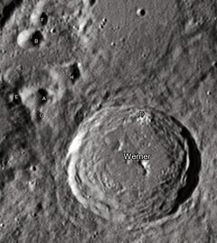 Werner is a prominent lunar impact crater that lies in the rugged south-central highlands of the Moon. It was named after the 15th-century German mathematician and astronomer Johannes Werner.[1] It is almost joined with the crater Aliacensis to the southeast, and the pair form a rugged valley in the intervening gap. Due west of Werner is the distorted Regiomontanus, and to the north is the remains of Blanchinus. It is from the Eratosthenian period, which lasted from 3.2 to 1.1 billion years ago.[2]