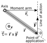 where [math]\displaystyle{ \vec r\times\vec F }[/math] is the cross-product, [math]\displaystyle{ F_\perp }[/math] is the component of [math]\displaystyle{ \vec F }[/math] perpendicular to [math]\displaystyle{ \hat r }[/math], [math]\displaystyle{ r_\perp }[/math] is the moment arm, and [math]\displaystyle{ \theta }[/math] is the angle between [math]\displaystyle{ \vec r }[/math] and [math]\displaystyle{ \vec F }[/math]