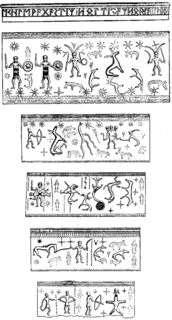 The first man Manu and his giant twin Yemo are crossing the cosmos, accompanied by a primordial cow. To create the world, Manu sacrifices his brother and, with the help of heavenly deities (the Sky-Father, the Storm-God and the Divine Twins),[4][13] forges both the natural elements and human beings from his twin's remains.[14][5]