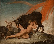 Roman versions of myth, which relied on earlier Greek texts, have been remodelled around an opposition between Hercules and a fire-breathing ogre named Cācus, who lives in a cave on the Aventine.[69][70] They have nonetheless retained some features of the original three-headed monstrous opponent: Hercules' club, with which he kills Cācus with three strikes, is said to be three-noded; and Hercules runs around the mountain three times after finding the monster's cave, batters the door three times, and sits down to rest three times before finally breaking in.[69] Like in the Iranian and Greek versions, Cācus is portrayed as the one who initially stole the cattle which rightfully belongs to the hero, Hercules.[68][70]