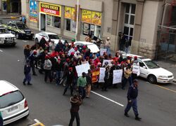 A small march by the EFF on Mandela Day (18 July) 2014 near the parliament building in Cape Town protesting in support of land reform in South Africa.