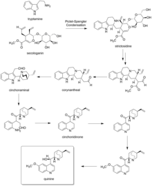 Suitable modification of strictosidine leads to an aldehyde. Hydrolysis and decarboxylation would initially remove one carbon from the iridoid portion and produce corynantheal. Then the tryptamine side-chain were cleaved adjacent to the nitrogen, and this nitrogen was then bonded to the acetaldehyde function to yield cinchonaminal. Ring opening in the indole heterocyclic ring could generate new amine and keto functions. The new quinoline heterocycle would then be formed by combining this amine with the aldehyde produced in the tryptamine side-chain cleavage, giving cinchonidinone. For the last step, hydroxylation and methylation gives quinine.[32][33]