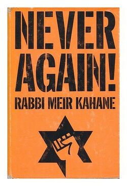 Writing about the phrase, Ellen Posman observed: "A past though often recent humiliation, and an emphasis on former victimhood, can lead to a communal desire for a show of strength that can easily turn violent."[15] Meir Kahane, a far-right rabbi, and his Jewish Defense League made use of the phrase. To Kahane and his followers, "Never again" referred specifically to the Jews and its imperative to fight antisemitism was a call to arms that justified terrorism against perceived enemies.[11][3][16] The Jewish Defense League song included the passage "To our slaughtered brethren and lonely widows: / Never again will our people's blood be shed by water, / Never again will such things be heard in Judea." After Kahane's death in 1990, Sholom Comay, president of the American Jewish Committee, said "Despite our considerable differences, Meir Kahane must always be remembered for the slogan 'Never Again,' which for so many became the battle cry of post-Holocaust Jewry."[11]