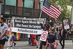 The phrase has been used by political advocacy groups Never Again Action, which opposes immigration detention in the United States, and by Never Again MSD, a group that campaigns against gun violence in the wake of the Stoneman Douglas shooting.[11][39]