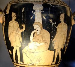 In the Homeric telling of the story,[2] Orestes is a member of the doomed house of Atreus, which is descended from Tantalus and Niobe. He is absent from Mycenae when his father, Agamemnon, returns from the Trojan War with the Trojan princess Cassandra as his concubine, and thus not present for Agamemnon's murder by Aegisthus, the lover of his wife, Clytemnestra. Seven years later, Orestes returns from Athens and avenges his father's death by slaying both Aegisthus and his own mother Clytemnestra.[3]