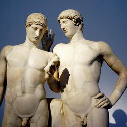 Taking the love god as the mediator of their emotions for each other, they sailed together as it were on the same vessel of life...nor did they restrict their affectionate friendship to the limits of Hellas....as soon as they set foot on the land of the Tauride, the Fury of matricides was there to welcome the strangers, and, when the natives stood around them, the one was struck to the ground by his usual madness and lay there, but Pylades "did wipe away the foam and tend his frame and shelter him with a fine well-woven robe," thus showing the feelings not merely of a lover, but also of a father. But when it had been decided that, while one remained to be killed, the other should depart for Mycenae to bear a letter, each wished to remain for the sake of the other, considering that he himself lived in the survival of his friend. But Orestes refused to take the letter, claiming Pylades was the fitter person to do so, and thus showed himself almost to be the lover rather than the beloved.