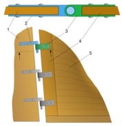 A type of heavy wheeled plough commonly found in Northern Europe.[4] The device consisted of four major parts. The first part was a Coulter (agriculture) at the bottom of the plough.[5] This knife was used to vertically cut into the top sod to allow for the plowshare to work.[5] The plowshare was the second pair of knives which cut the sod horizontally, detaching it from the ground below.[5] The third part was the moldboard, which curled the sod outward.[5] The fourth part of the device was the team of eight oxen guided by the farmer.[6] This type of plough eliminated the need for cross-plowing by turning over the furrow instead of merely pushing it outward.[6] This type of wheeled plough made seed placement more consistent throughout the farm as the blade could be locked in at a certain level relative to the wheels.[7] A disadvantage to this type of plough was its maneuverability.[7] Since this equipment was large and lead by a small herd of oxen, turning the plough was difficult and time-consuming.[7] This caused many farmers to turn away from traditional square fields and adopt a longer, more rectangular field to ensure maximum efficiency.[7]