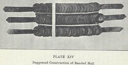The most common type during the 11th through the 16th centuries was the Hauberk, also known earlier than the 11th century as the Carolingian byrnie.[48] Made of interlinked rings of metal, it sometimes consisted of a coif that covered the head and a tunic that covered the torso, arms, and legs down to the knees. Chain mail was very effective at protecting against light slashing blows but ineffective against stabbing or thrusting blows. The great advantage was that it allowed a great freedom of movement and was relatively light with significant protection over quilted or hardened leather armour. It was far more expensive than the hardened leather or quilted armour because of the massive amount of labor it required to create. This made it unattainable for most soldiers and only the more wealthy soldiers could afford it. Later, toward the end of the 13th century banded mail became popular.[49] Constructed of washer shaped rings of iron overlapped and woven together by straps of leather as opposed to the interlinked metal rings of chain mail, banded mail was much more affordable to manufacture. The washers were so tightly woven together that it was very difficult penetrate and offered greater protection from arrow and bolt attacks.[50]