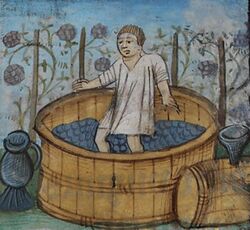 This device was the first practical means of Pressing (wine) on a plane surface.[14] The wine press was an expensive piece of machinery that only the wealthy could afford.[14] The method of Grape stomping was often used as a less expensive alternative.[14] While white wines required the use of a wine press in order to preserve the color of the wine by removing the juices quickly from the skin, red wine did not need to be pressed until the end of the juice removal process since the color did not matter.[14] Many red wine winemakers used their feet to smash the grapes then used a press to remove any juice that remained in the grape skins.[14]