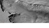 Asimov contains many gullies. Martian gullies are small, incised networks of narrow channels and their associated downslope sediment deposits, found on the planet of Mars. They are named for their resemblance to terrestrial gullies. First discovered on images from Mars Global Surveyor, they occur on steep slopes, especially on the walls of craters. Usually, each gully has a dendritic alcove at its head, a fan-shaped apron at its base, and a single thread of incised channel linking the two, giving the whole gully an hourglass shape.[3] They are believed to be relatively young because they have few, if any craters.