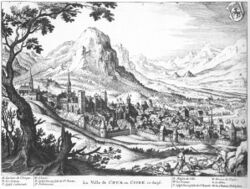 File:ETH-BIB-Chur v. N. aus 300 m-Inlandflüge-LBS MH01-005044.tif In 1523 Johannes (Dorfmann) Comander was appointed parish priest of St Martin's Church and began preaching the new faith of the Protestant Reformation. It spread rapidly and by 1525 the bishop had fled the city and Protestant services were taking place in the churches of St Martin and St Regula.[13] The Ilanz articles of 1524 and 1526 allowed each resident of the Three Leagues to choose their religion and sharply reduced the political and secular power of the Bishop of Chur and all monasteries in League territory.[14] By 1527 all of Chur except the bishop's estates had adopted the Reformation. On 1 January 1529 Abbot Theodore Schlegel was publicly beheaded. Bishop Thomas Planta, a friend of St Charles Borromeo, tried, but without success, to suppress Protestantism. He died, probably poisoned, on 5 May 1565.[15]