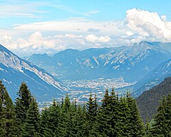 Chur is situated at a height of 1,949 ft (594 m) above sea level, on the right bank of the torrent Plessur just as it issues from the valley Schanfigg and about a mile above its junction with the Rhine, almost entirely surrounded by the Alps, overshadowed by the Mittenberg (northeast) and Pizoggel (southwest), hills that guard the entrance to the deep-cut valley Schanfigg.[7]