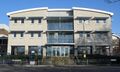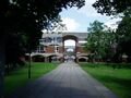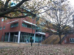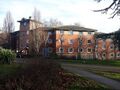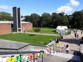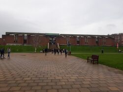 The campus is self-contained, with facilities including eights cafes/restaurants, a post office, a Co-op Food store, a market, a bank, a pharmacy, a health centre (including a dentist) and childcare facilities.[37] Spence's designs were appreciated by architects; many of the campus buildings won awards. A number of features define these buildings, including the materials used and the fact that many of them have planted and tree-filled courtyards. The gatehouse-inspired Falmer House won a bronze medal from the Royal Institute of British Architects.[5] Another campus building, The Meeting House, won the Civic Trust award in 1969.[38] In 1993, the buildings which made up the core of Spence's designs were given listed building status, with Falmer House being awarded the highest designation, Grade 1, as a building of "exceptional interest".[38] A number of the original buildings are now Grade II listed buildings.[39]