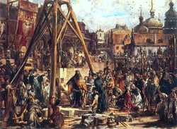 Poles reached Lithuania long before the union of the two countries. In a letter to the German Franciscans, Grand Duke Gediminas asked them to send monks who spoke Samogitian, Ruthenian or Polish. Other sources mention Polish slave carers and educators of children. This indicates the presence of Poles, probably prisoners of war or their descendants.[3] Polish influence increased considerably after the Union of Krewo (1386). The Lithuanian Grand Duke Jogaila was offered the Polish crown and became Władysław II Jagiełło (reigned 1386–1434). This marked the beginning of the gradual, voluntary Polonization of the Lithuanian nobility.[4][5][6] Jagiełło built many churches in pagan Lithuanian land and provided them generously with estates, gave out the lands and positions to the Catholics, settled the cities and villages and granted the biggest cities and towns Magdeburg rights in their Polish variant.[7]