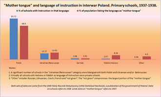 The change came after the May Coup of 1926. Despite the abolition of the Belarusian Belarusian Social Democratic Party, for its contacts with the Comintern, there was a period of liberalization of educational policy. The new Minister of Education, Gustav Dobrotsky, ordered the dismissal of officials blocking the establishment of new schools, allowed new schools to open in Catholic communities as well, and organized Belarusian language courses for elementary school teachers. As a result, four Belarusian grammar schools and a dozen elementary schools were opened.[75] The results, however, were poor. In 1928, there were only 69 schools with Belarusian language, all of them in Wilno and Nowogródek voivodeships, very small number in comparison with 2 164 Polish schools existing there.[76] The reversal of this policy came quickly, and after 1929 the number of Belarusian schools began to decline again. Of the Belarusian gymnasiums existing in Vilnius, Navahrudak, Kletsk and Radashkovichy, only the Vilnius gymnasium had survived to 1939.[73] Belarusian schools often conducted classes in Russian, this was especially true of gymnasiums . This resulted from the significant Russification of the Belarusian intelligentsia.[77] The Polish officials often treated any Belarusian demanding schooling in Belarusian language as a Soviet spy and any Belarusian social activity as a product of a communist plot.[78]