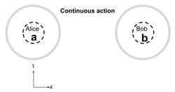 The simplest locality model is no locality: instantaneous action at a distance with no limits for relativity. The locality model for action at a distance is called continuous action.[2] The gray area (a circle here) is a mathematical concept called a "screen". Any path from a location through the screen becomes part of the physical model at that location. The gray ring indicates events from all parts of space and time can affect the probability measured by Alice or Bob. So in the case of continuous action, events at all times and places affect Alice's and Bob's model. This simple model is highly successful for solar planetary dynamics with Newtonian gravity and in electrostatics, cases where relativistic effects are insignificant.