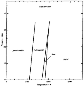 β-neptunium takes on a distorted tetragonal close-packed structure. Four atoms of neptunium make up a unit cell, and the Np–Np bond lengths are 276 pm.[10] γ-neptunium has a body-centered cubic structure and has Np–Np bond length of 297 pm. The γ form becomes less stable with increased pressure, though the melting point of neptunium also increases with pressure.[10] The β-Np/γ-Np/liquid triple point occurs at 725 °C and 3200 MPa.[10][14]