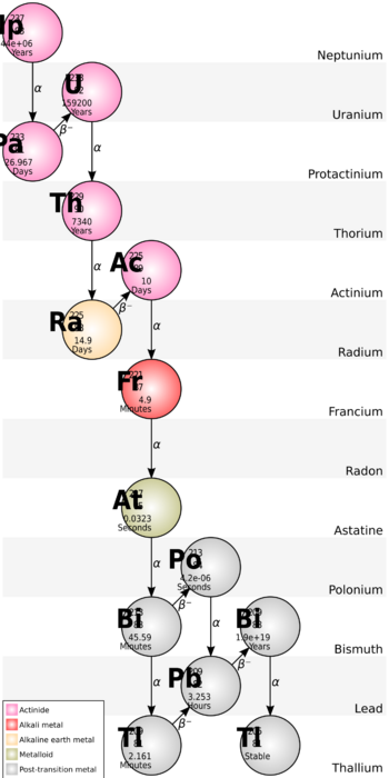 The isotopes of neptunium range in atomic weight from 219.032 u (219Np) to 244.068 u (244Np), though 221Np and 222Np have not yet been reported.[22] Most of the isotopes that are lighter than the most stable one, 237Np, decay primarily by electron capture although a sizable number, most notably 229Np and 230Np, also exhibit various levels of decay via alpha emission to become protactinium. 237Np itself, being the beta-stable isobar of mass number 237, decays almost exclusively by alpha emission into 233Pa, with very rare (occurring only about once in trillions of decays) spontaneous fission and cluster decay (emission of 30Mg to form 207Tl). All of the known isotopes except one that are heavier than this decay exclusively via beta emission.[22][23] The lone exception, 240mNp, exhibits a rare (>0.12%) decay by isomeric transition in addition to beta emission.[22] 237Np eventually decays to form bismuth-209 and thallium-205, unlike most other common heavy nuclei which decay into isotopes of lead. This decay chain is known as the neptunium series.[16][24] This decay chain had long been extinct on Earth due to the short half-lives of all of its isotopes above bismuth-209, but is now being resurrected thanks to artificial production of neptunium on the tonne scale.[25]