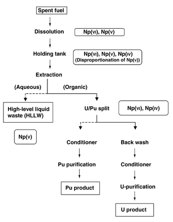 Most methods that separate neptunium ions exploit the differing chemical behaviour of the differing oxidation states of neptunium (from +3 to +6 or sometimes even +7) in solution.[72] Among the methods that are or have been used are: solvent extraction (using various extractants, usually multidentate β-diketone derivatives, organophosphorus compounds, and amine compounds), chromatography using various ion-exchange or chelating resins, coprecipitation (possible matrices include LaF3, BiPO4, BaSO4, Fe(OH)3, and MnO2), electrodeposition, and biotechnological methods.[73] Currently, commercial reprocessing plants use the Purex process, involving the solvent extraction of uranium and plutonium with tributyl phosphate.[69]