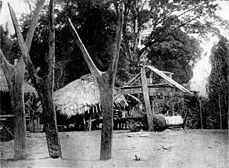 Practically the whole Wa region is rugged mountainous territory with steep hills and deep valleys. There were no urban areas. A section of the historical Wa territory was included in the state of Manglon, one of the Shan States. Sir James George Scott visited the Wa States around the turn of the century and wrote about the place, taking pictures of the people and the houses of the area as well.[1] Considered a distant and inaccessible border area by former empires, the British census of 1901 did not include the Wa States, so statistics regarding a population over 50,000 in 1911 are estimates.[2]