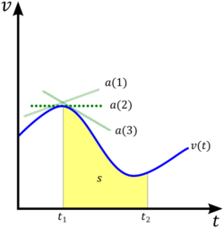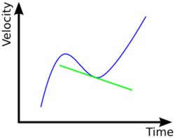 where [math]\displaystyle{ v }[/math] is the velocity, and [math]\displaystyle{ t }[/math] is the time. This slope therefore defines the average acceleration over the interval, and reducing the interval infinitesimally gives [math]\displaystyle{ \begin{matrix} \frac{dv}{dt} \end{matrix} }[/math], the instantaneous acceleration at time [math]\displaystyle{ t }[/math], or the derivative of the velocity with respect to time (or the second derivative of the position with respect to time). In SI, this slope or derivative is expressed in the units of meters per second per second ([math]\displaystyle{ \mathrm{m/s^2} }[/math], usually termed "meters per second-squared").