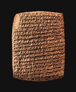 Slavery was an intrinsic part of nearly every society in the ancient Near East.[167] There were two main types of slaves in ancient Assyria: chattel slaves, primarily foreigners who were kidnapped or who were spoils of war, and debt slaves, formerly free men and women who had been unable to pay off their debts.[168] In some cases, Assyrian children were seized by authorities due to the debts of their parents and sold off into slavery when their parents were unable to pay.[169] Children born to slave women automatically became slaves themselves,[170] unless some other arrangement had been agreed to.[171] Though Old Babylonian texts frequently mention the geographical and ethnic origin of slaves, there is only a single known such reference in Old Assyrian texts (whereas there are many describing slaves in a general sense), a slave girl explicitly being referred to as Subaraean, indicating that ethnicity was not seen as very important in terms of slavery.[172] The surviving evidence suggests that the number of slaves in Assyria never reached a large share of the population.[162] In the Akkadian language, several terms were used for slaves, commonly wardum, though this term could confusingly also be used for (free) official servants, retainers and followers, soldiers and subjects of the king. Because many individuals designated as wardum in Assyrian texts are described as handling property and carrying out administrative tasks on behalf of their masters, many may have in actuality been free servants and not slaves in the common meaning of the term.[167] A number of wardum are however also recorded as being bought and sold.[173]