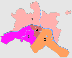 The city was divided into districts in 1936. The districts were updated several times in 1965 and 1976. The final city division, currently in use, divides the city into four districts: