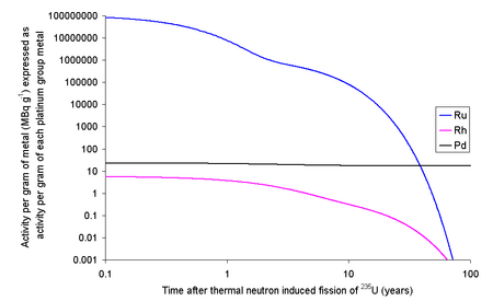Each kilogram of the fission products of 235U will contain 63.44 grams of ruthenium isotopes with halflives longer than a day. Since a typical used nuclear fuel contains about 3% fission products, one ton of used fuel will contain about 1.9 kg of ruthenium. The 103Ru and 106Ru will render the fission ruthenium very radioactive. If the fission occurs in an instant then the ruthenium thus formed will have an activity due to 103Ru of 109 TBq g−1 and 106Ru of 1.52 TBq g−1. 103Ru has a half-life of about 39 days meaning that within 390 days it will have effectively decayed to the only stable isotope of rhodium, 103Rh, well before any reprocessing is likely to occur. 106Ru has a half-life of about 373 days, meaning that if the fuel is left to cool for 5 years before reprocessing only about 3% of the original quantity will remain; the rest will have decayed.[1] To put the values in the table into perspective, the activity in natural potassium (due to naturally occurring 40K) is about 30 Bq per gram.[citation needed]