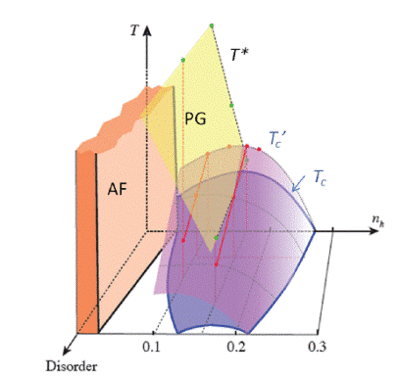 Therefore, we have been led to conclude that one should not consider that a universal phase diagram occurs in the ($n_{h},T$) plane for the cuprates. Intrinsic or extrinsic disorder induces changes on the actual physical properties, which are reflected in the doping dependence of the phase diagram. We have suggested that this can be taken into account in an extension to 3D of the phase diagram in which the third axis represents the disorder as an extra parameter (Fig. 11). One can see there that the extension of the magnetic disordered phase between the AF state and the SC dome increases with disorder, as evidenced in Fig. 6(a). In this sketch of a phase diagram the pseudogap line remains insensitive to disorder. The onset of SC fluctuations $T'_{c}$, as determined from the SC fluctuations contribution to the conductivity is also represented there. It is seen that $T'_{c}$ is only slightly above the SC dome and is less modified than $T_{c}$ by an increasing disorder. In such a representation one can see that the variation of optimal $T_{c}$ and the various phase diagrams encountered in specific cuprate families can be tentatively associated with distinct amounts of disorder. They would be generated by vertical cuts taken for fixed disorder.
