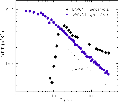 Hints for such a LL state could be seen at high $T$ in the organic TMTSF compounds (Wzietek et al, 1993), which are quasi 1D materials. However in these compounds the LL state could not be followed toward low $T$ as it is obscured by the existence of 2D competing magnetic states which are gapped at low $T$. As will be seen in section 10 these compounds display phase diagrams with a proximity between magnetic and SC phases as for the cuprates. However in such quasi 1D compounds the number of carriers is difficult to modify, and the electronic properties are rather spanned by changes of transfer integrals induced by an applied pressure. A LL behaviour has been better evidenced by NMR from $1/T_{1}$ measurements on $^{13}$C in single wall carbon nanotubes (SWCNT). Such nanotubes were expected to display one dimensional behaviour (Giamarchi 2004). The NMR data shown in Fig.8 does indeed evidence a power law exponent on a large $T$ range. Conversely $^{13}$C NMR data taken on the inner tubes of double wall tubes (DWCNT) rather exhibit a metallic state at high $T$ with a gap opening at low temperature, which is not really understood so far. It could be speculatively assigned to a loss of 1D behaviour associated with nanotube curvature effects. For completeness let us mention a spin system of reduced dimensionality (C$_{5}$H$_{12}$N)$_{2}$CuBr$_{4}$ which can be considered as formed of nearly decoupled chains of singlet dimers. In those 1D chains the triplet excitations of the dimers have been shown to form a Luttinger Liquid (Giamarchi 2004).