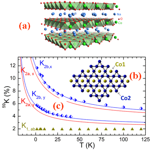 The concentration of such Co$^{3+}$ sites evolves markedly on the phase diagram from $x=1$ to $x=1/2$. All Co sites are Co$^{3+}$ in Na$_{1}$CoO$% _{2}$ which is a band insulator. For $x<1$ only a limited number of Na compositions with specific Na orderings can be synthesized. With decreasing Na content, the compound becomes metallic, and the fraction of Co$^{3+}$ sites is found to decrease and to vanish for $x\leq 0.5$. As shown herafter, the non magnetic Co$^{3+}$ sites are found to form ordered arrays in a metallic Co background responsible for the magnetic properties. Detailed studies of the $^{59}$Co NMR for the other sites have been achieved mostly for two concentrations $x=2/3$ and $x=10/13\simeq 0.77$ which are at boundaries between specific behaviors in the low $T$ electronic properties. On the $x=2/3$ phase NMR/NQR experiments have allowed the determination of both the 2D Na ordered structure and the 3D stacking of Na/Co planes. The Co$ ^{3+}$ ions are stabilized on 25% of the cobalt sites Co1 arranged in a triangular sublattice. The holes are delocalized on the 75% complementary cobalt sites Co2 which display a planar cobalt kagomé structure (as shown in (Fig. 14(c)), with an average charge state close to Co$^{3.5+}$. The parameters of the Zeeman and quadrupolar Hamiltonians have been determined for all cobalt sites in the unit cell and this has permitted to evidence that the magnetic properties are dominated by the large $T$ dependence of the susceptibility at the Co2 sites (Fig. 14(b)). They unexpectedly display a strong in-plane electronic anisotropy which could agree with an orbital ordering along the kagome sublattice organization. These experimental results resolve a puzzling issue by precluding localized moment pictures for the magnetic properties of sodium cobaltates. Indeed some theoretical speculations suggested that Na order pins local magnetic moments in a metallic and less magnetic bath.