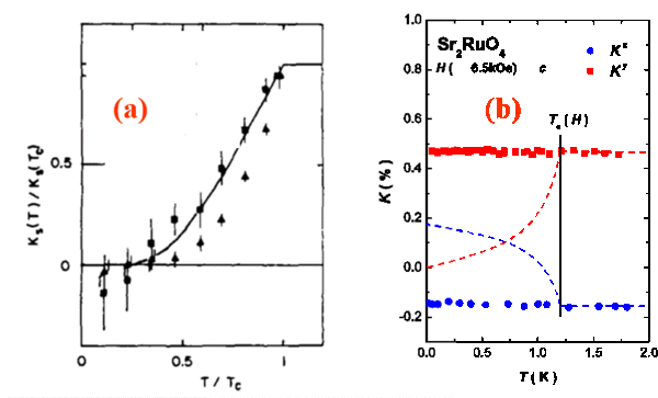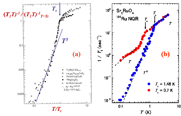 In correlated electron systems one similarly expects that with spin triplet SC the behavior of the NMR shift below $T_{c}$ should permit to establish the spin triplet pairing and to determine the superposition of spin states. A system which has been thoroughly studied is Sr$_{2}$RuO$_{4}$, in which the RuO$_{2}$ form a square lattice which is similar to that of the cuprate La$_{2}$CuO$_{4}$. Indeed it has been shown in that compound that both $^{17}$O and $^{99}$Ru NMR shifts exhibit absolutely no change though $T_{c}$, Fig. 12 (b) which is a strong case for spin triplet SC with equal spin states (Ishida et al 1998). Once the spin properties of the pairs has been established, their orbital state has a symmetry which is imposed by the total antisymmetry of the wave function. So that an antisymmetric spin singlet state implies an even orbital state, that is an $s$ or $d$-wave symmetry of the wave function. Similarly for a symmetric triplet state, the orbital wave function should be antisymmetric that is $p$-wave or higher order.... In most of these exotic pairing states the SC gap is not uniform over the Fermi surface as is the case for most phonon mediated cases. In these exotic superconductors the gap depends of the wave vector (k, -k) of the pairs and might exhibit gap nodes for some k values or some wave vector directions. For instance for a 2D system, if the gap has a $d$-wave wave order parameter symmetry, the gap changes sign and therefore vanishes along two axes of the unit cell. This implies that the gapless states will be filled much faster with increasing $T$ than in a pure $s$ wave BCS superconductor.