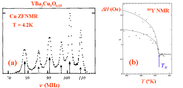 More of course can be learnt if the magnetic order is simple enough to induce a well defined internal field on the magnetic sites, so that the associated Larmor frequency might be detected in zero applied field. Simple examples can be taken from the undoped parent AF states of the cuprates, such as La$_{2}$CuO$_{4}$ or YBa$_{2}$Cu$_{3}$O$_{6}$. In the latter the Cu atoms of the CuO$_{2}$ planes are in a configuration $3d^{9}$ which bears a $S=1/2$ moment. Their $^{63}$Cu NMR can therefore be detected in the absence of any external applied field ( see Fig. 15(a)). Let us point out that the internal field being a measure of the local magnetization, can be taken as the order parameter of the magnetic phase, which vanishes above the Néel temperature. But usually the magnetic moment and the internal field associated with a magnetic state are so large that the NMR of the magnetic site, or its temperature dependence, might be hard to detect for various technical reasons, the least being the fact that one usually has to perform a blind search of the Larmor frequency. In many cases the occurrence of a magnetic state is better detected using the NMR of near neighbor sites through weaker transferred hyperfine couplings. The NMR of such sites are detected in the paramagnetic state in a an applied field and, the induced internal fields being small, they can be seen to appear at the magnetic transition temperature. This has been done for instance using the La NQR spectra in La $_{2}$CuO$_{4}$. The use of the NMR of non magnetic sites of the structure adds a further local sensitivity to the actual arrangement of the moments in the magnetic phase. For instance, the induced internal field cancels on sites which are in a symmetric position within a bipartite AF structure. This occurs for the $^{63}$Cu site of the intermediate layer of Cu sites located between the CuO$_{2}$ planes in YBa$_{2}$Cu$_{3}$O$_{6}$. Being in a $3d^{10}$ non magnetic configuration the $^{63}$Cu NMR signal of those sites can only be detected with an applied field. Similarly the local field on the $^{89}$Y site which is located between the two AF CuO$_{2}$ layers cancels in this compound. This does not forbid fully the possibility to detect the occurrence of AF on those sites as the unavoidable defects in the crystalline structure does yield a small imbalance of the local field which is sufficient to be seen as a broadening of the $^{89}$Y NMR signal at $T_{N}$. (see Fig. 15(b)).