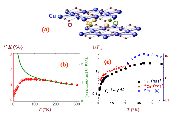 A rather interesting novel situation has been promoted in the last decade by the study of specific lattices in which frustration prohibits the formation of ordered spin structures in the absence of any disorder. By frustration we mean that the geometry of the lattice, or the spatial dependence of the interaction between sites, are such that all pair-wise interactions between sites cannot be minimized altogether. The frustration effects are favored if one organizes crystal structures by edge or corner sharing of triangles. They already occur in the 2D triangular lattice, in which ordered states can only occur with neighboring spins with relative orientations at $120°$. One of the most famous regular case which has been studied at length recently is that of the 2D Kagome structure, in which a macroscopic degeneracy of the ground state could be expected. If furthermore the spins involved in such a structure are $S=1/2$, the quantum fluctuations are expected to be large and an ordered state is not anticipated even at $T=0$. The resulting spin state is considered as a spin liquid. The archetype of such a Kagome spin 1/2 compound has been found in a natural mineral, the Herbertsmithite, which could be synthesized after its discovery ( Fig. 16 (a) ). In that case the spin susceptibility, as measured by the $^{17}$O NMR shift in powder samples is still paramagnetic at $T<<J/k_{B}$, where $ J\simeq 200 $ K. It is even seen to decrease at low $T$ and frozen spin order is not detected down to 100 mK (Olariu et al 2008). This is corroborated by the persistence of magnetic fluctuations down to the lowest $T$ as monitored by the power law increase of the spin lattice relaxation $1/T_{1}$ data (Fig. 16(b)) (Carretta and Keren 2011). These experiments therefore highlight the importance of NMR in such systems, which permit to isolate the susceptibility of the Kagome plane and give direct evidence for the dynamical character down to the lowest $T$. Such spin liquid states are viewed as ideal realizations of quantum states in which the spins are paired in $S=0$ dynamic resonating valence bond states (RVB). Such states were initially suggested by P.W. Anderson (1987) to describe the parent state of the cuprates, a proposal which triggered an intense and still on-going activity on geometrically frustrated antiferromagnets. The RVB suggestion did not turn out to be true for he cuprates, although various authors consider that at low doping such RVB states are restored, hence the loss of AF state.