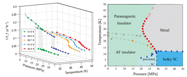 In the (BEDT-TTF)$_{2}$X compounds the organic molecules have a quasi triangular structure and the phase diagram depends somewhat of the actual anion X introduced between the organic salt layers. NMR permitted to evidence that in the Mott Insulator case the compound with X=Cu$\left[ \text{ N(CN)}_{2}\right] $Cl displays an AF state at low $T$ and becomes under pressure a SC with the highest $T_{c}=12$ K found so far in organic compounds ( Fig. 17 (b))(Kagawa et al 2009). For X=Cu$_{2}$(CN)$_{3}$ a less ordered magnetic phase not far from a spin liquid occurs and the SC state $T_{c}=2.5$ K is lower (Kurosaki et al2005). This has been ascribed to changes in the anisotropy ratio $t/t'$ of transfer integrals in the distorted triangular lattice, which corresponds to an increase of the frustration in the latter compound. This system therefore exhibits a unique situation of a pressure induced Mott transition between a frustrated spin liquid and a SC state.