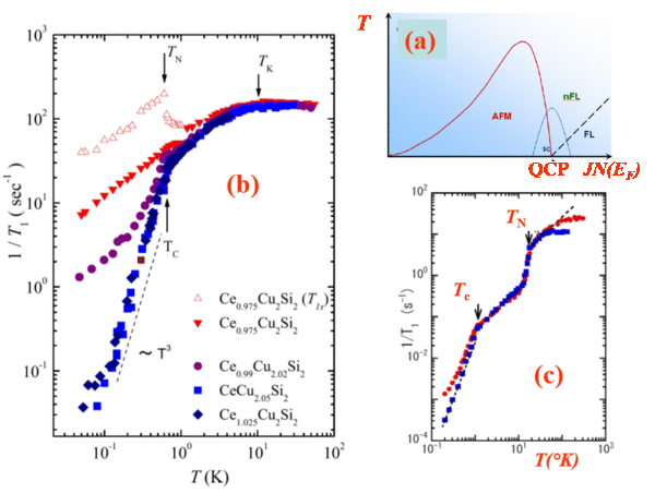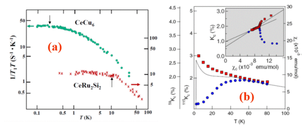 But what happens if one considers then the high $T$ local moment regime above the Kondo temperature $T_{K}$ of the isolated impurities? There the nuclear spin lattice relaxation $1/T_{1}$ is nearly $T$ independent, and it only acquires a $T$ variation close to the Kondo temperature $T_{K}$ which is extracted from the analyses of the resistivity and the magnetic specific heat. As can be seen in Fig.2(a), a Korringa like $T$ variation characteristic of the Fermi liquid ground state is only reached at much lower $T$. So, contrary to the single Kondo impurity case where $T_{K} $ is the single energy scale required to describe the physics, here a second energy scale is needed. It points out a regime often labelled as $T_{coh}$, where the Kondo singlets acquire a coherent band behavior (Yang Y. et al, 2008). As displayed in Fig. 2(a), ratios $T_{coh}/T_{K}$ of 0.03 and 0.67 were respectively found for CeCu$_{6}$ and CeRu$_{2}$Si$_{2}$, which emphasizes that the two energy scales are material dependent. The existence of this coherence regime has been detected as well as a non linear scaling of the NMR shift with the susceptibility (Curro 2009), suggesting a change of hyperfine coupling with temperature as highlighted in Fig. 2(b). The existence of $T_{coh}$ is detected as well in the transport properties. Overall these results demonstrate that the heavy-electron states display both high $T$ local moment and low $T$ extended band behaviors.