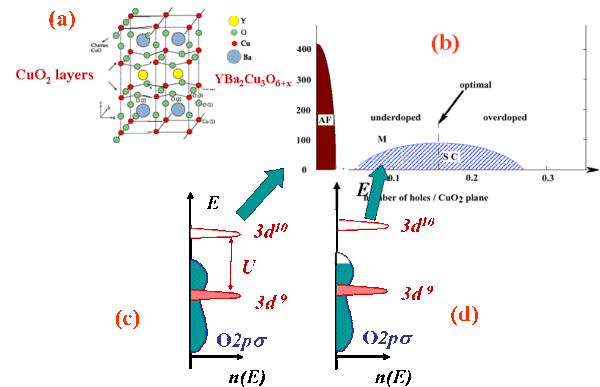 The importance of the cuprates in the physics of correlated systems has resulted from the discovery that when the AF is suppressed by hole doping, the doped metallic state which results has a SC ground state and displays strange metallic and magnetic properties. The most surprising feature has been the fact that the superconductivity discovered in these materials has the highest critical temperatures $T_{c}$ found so far in any superconducting material, and exceeds any $T_{c}$ which could be expected within the BCS approach known to apply in classical metallic states. An important observation in the cuprates has been the fact that the phase diagram with increasing hole doping displays a dome shaped SC regime, that is SC disappears for dopings beyond about 0.3. These non expected features have immediately led to the idea that SC in the cuprates has an exotic origin linked with electron electron interactions rather than the classical electron phonon driven superconductivity which prevails in classical metals.