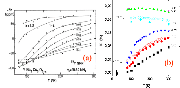 The feature which had been clearly evidenced was that for$^{89}$Y nuclear spins $(T_{1}T)^{-1}$ and $^{89}$K have very similar $T$ variations (with $T$ and doping). This is illustrated in Fig. 7 (b) on data taken on field-aligned YBCO samples realized for two compositions, O$_{7}$ for which $(T_{1}T)^{-1}$ is $T$ independent as is $^{89}K$, while for O$_{6.6}$ both quantities exhibit large $T$ increases. Similar results on the $^{17}$O NMR have been obtained, which established that the dynamic susceptibility viewed by these nuclei appeared quite correlated with the static susceptibility. It has been established that $T_{1}TK_{s}$ is nearly $T$ independent, which has been taken as an evidence for the presence of a Fermi-liquid like component in the magnetic response.