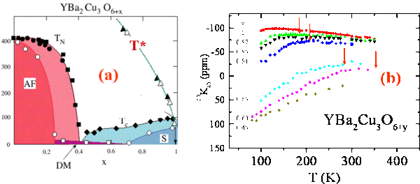 The optimally doped highest $T_{c}$ compounds exhibited a rather regular $T$ independent susceptibility together with a strange linear $T$ variation of resistivity above $T_{c}$. The possibility to control the hole doping in the YBa$_{2}$Cu$_{3}$O$_{6+x}$ cuprate by decreasing the oxygen content which is inserted in the intermediate planes between the CuO$_{2}$ planes permitted controlled NMR experiments in the underdoped regime for which $T_{c}$ drops with decreasing hole doping. Those experiments revealed a quite distinct behavior of the NMR shifts with a dramatic drop of the spin component $K_{s}$ that is of the spin susceptibility with decreasing $T$. Such an observation done initially by $^{89}$Y NMR measurements (see Fig. 5 (a)) remarkably revealed that for a composition with $T_{c}=60 $K, the spin susceptibility drops of more than a factor three between room $T$ and $T_{c}$ (Alloul et al 1989). As the spin susceptibility remains still sizable at $T_{c}$, this appeared as the signature of the opening of an imperfect gap which was qualified as a pseudogap already in 1989. This is remarkable inasmuch as it was not experimentally possible to detect any further sharp decrease of the spin susceptibility below $T_{c}$. The other aspect which was revealed by these experiments is that the onset temperature $T^{\ast }$ of the drop in $K_{s}$ increases with decreasing doping. This had led to the indication that the pseudogap magnitude increases with decreasing doping that is with decreasing $T_{c}$. Most other experiments measuring uniform macroscopic responses, such as specific heat, planar resistivity $\rho _{ab}$, do detect an onset at similar temperatures as that of $T^{\ast },$ (Timusk and Statt 2000), which is undoubtedly the highest temperature below which a detectable deviation with respect to the high $T$ Pauli like behavior occurs. Signatures for the pseudogap have been seen as well on optical absorption, photoemission (ARPES), or tunnel effect experiments.