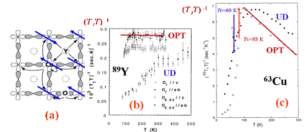 Let us assume that the Cu holes responsible for the local moments yielding the AF state of the parent compounds and of the doped holes expected to be located on the oxygen orbitals are uncorrelated. In that case the macroscopic magnetic susceptibility should sum up the contributions of these two bands, while the $^{63}$Cu nuclear spins would probe the spin contribution on the copper sites. Similarly the $^{89}$Y and $^{17}$O nuclear spins would be more likely coupled to the oxygen holes. The determination of the hyperfine fields (NMREPS) which couple the nuclear spins with the susceptibility has been essential in the understanding of the electronic structure. The anisotropies of orbital contributions to the $^{63}$Cu NMR shifts and of the $^{63}$Cu spin hyperfine couplings permitted to establish that the Cu holes are located in the Cu 3d$_{x^{2}-y^{2}}$ orbitals (Takigawa et al 1990). The evidence for a negative hyperfine coupling of $^{89}$Y with the spin susceptibility allowed to demonstrate that $^{89}$Y also probes the susceptibility localised on the Cu 3d$_{x^{2}-y^{2}}$orbitals through a transferred hyperfine coupling via O2p$_{\sigma }$ orbitals (Alloul et al, 1988), which was found identical for the insulating and doped compounds. This suggested that the spin susceptibility resides on a single spin fluid (Mila and Rice 1989), involving Cu 3d$_{x^{2}-y^{2}}$- O2p$_{\sigma }$ hybridized orbitals, so that the two type of holes are correlated and not independent as would be suggested by Fig. 4 (d). This is fully confirmed below by the analysis of the $T$ variations of the NMR shifts.