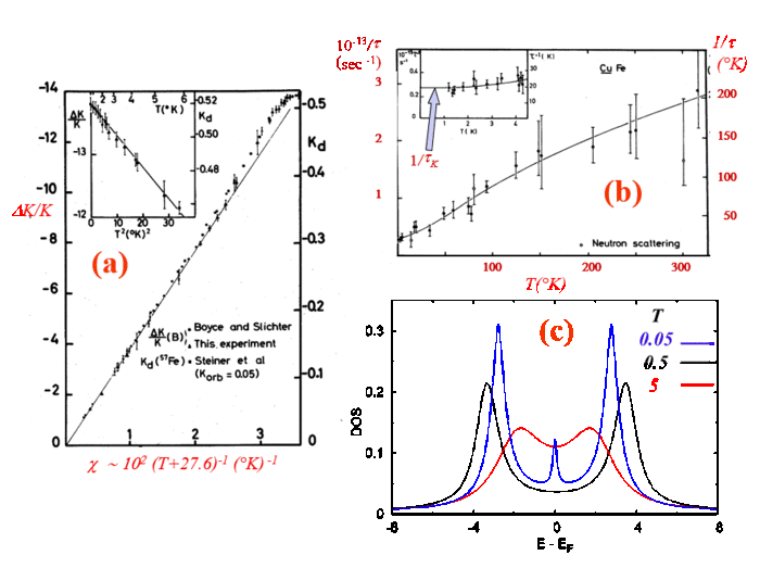 This idea of a Kondo singlet has led to some attempts to detect modifications of the host $^{63}$Cu NMR width when $T$ is decreased through $T_{K}$. Those early experiments were initially taken as a signature of the development of a static polarized cloud anti-parallel to the local impurity magnetization. But the situation was only fully clarified when NMR resonances of $^{63}$Cu near neighbors to the Fe were detected (see NMREPS). The shifts of the various lines had $T$ variations which scaled with each-other and displayed the same Curie-Weiss dependence as the magnetic susceptibility data taken in very dilute samples, as displayed in Fig. 1(a). So, on a small number of sites near the impurity, the magnetic behaviour does display a smooth $T$ variation through $T_{K}$, which allowed one to deny the existence of a static compensating cloud. This result confirmed that the susceptibility reaches a low $T$ behavior similar to that achieved in a non-magnetic case, as has been also found by the numerical solutions of the Kondo model established by Wilson (Nobel prize) (Wilson 1975). However, these results do not give any answer about the spatial extension of the correlated Kondo state (this matter is discussed in Alloul, 2012).