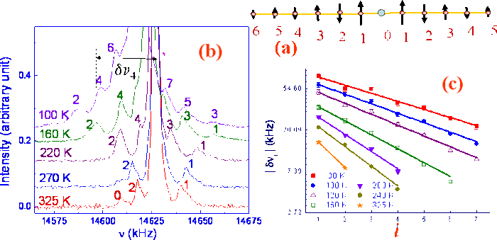 In actual chain materials the chains are never of infinite length so a chain end is a defect which induces a magnetic response on the chain. A quantitative study of these effects can be done by introducing a controlled concentration of impurities which disrupt the chains (Fig. 9(a)). For instance Zn, Mg with $(S=0)$ and Cu with $(S=1/2)$ have been used as substituents at the Ni site of the Y$_{2}$BaNiO$_{5}$ compound in which the $ S=1$ spins at the Ni sites form a chain (this is typical case of an integer spins chain, named as Haldane chain). The $^{89}$Y NMR spectrum consists of a central peak and several less intense satellite peaks which permit to probe the staggered magnetization (Teloldi et al, 1999). In the NMR spectra of Fig. 9(b) the central peak corresponds to chain sites far from the defects and its NMR shift measures the uniform susceptibility, which displays a Haldane gap ~ 100 K which corresponds to an antiferromagnetic (AF) coupling $J\approx 260$ K between the nearest neighbor Ni spins. The satellite lines are evenly distributed on the two sides of the central peak. The magnitude of their shifts $\delta \nu _{i}(T)|$ with respect to the main line varies exponentially as a function of distance to the impurity at any given $T$ (Fig. 9(c)). From fits with \[ |\tag{8}\delta \nu _{i}\,(T)|=|\delta \,\nu _{1}(T)|e^{-\frac{(i-1)}{\xi _{imp}(T)}} \] one deduces the extension $\xi _{imp}(T)$ of the induced staggered magnetization. The values of $\xi _{imp}(T)$ extracted from these measurements are found almost identical to the pure correlation length computed by Monte Carlo simulations for an infinite $S=1$ chain with no defects. The characteristic length of the staggered magnetization near defects therefore reveals the intrinsic $\xi $ of the infinite $S=1$ chain, in the explored $T$ range (Teloldi et al, 1999). Furthermore the $T$ dependence of the induced paramagnetic moment has been found to display a Curie free spin behavior.