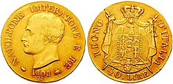 The kingdom was given a new national currency, replacing the local coins circulating in the country: the Italian lira, of the same size, weight, and metal of the French franc.[5] Mintage being decided by Napoleon with an imperial decree on 21 March 1806, the production of the new coins began in 1807. The monetary unit was the silver lira, which was 5 grams heavy. There were multiples of £2 (10 grams of silver) and £5 (25 grams of silver), and precious coins of £20 (6.45 grams of gold) and £40 (12.9 grams of gold). The lira was basically divided in 100 cents, and there were coins of 1 cent (2.1 grams of copper), 3 cents (6.3 grams of copper), and 10 cents (2 grams of poor silver), but following the tradition, there was a division in 20 soldi, with coins of 1 soldo (10.5 grams of copper, in practice 5 cents), 5 soldi (1.25 grams of silver), 10 soldi (2.5 grams of silver), and 15 soldi (3.75 grams of silver).