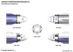 At a NASA news conference on 18 May 2012, SpaceX confirmed their target launch price for crewed Dragon flights of $160 million, or about $20 million per seat if the maximum crew of 7 is aboard and NASA orders at least four Crew Dragon flights per year.[28] This contrasts with the 2014 Soyuz launch price of $76 million per seat for NASA astronauts.[29] The spacecraft's design was unveiled on 29 May 2014, during a press event at SpaceX headquarters in Hawthorne, California.[30][31][32] In October 2014, NASA selected the Dragon spacecraft as one of the candidates to fly American astronauts to the International Space Station under the Commercial Crew Program.[33][34][35] SpaceX plans to use the Falcon 9 Block 5 launch vehicle for launching Dragon 2.[4]