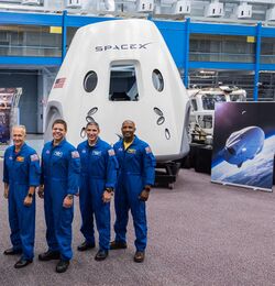 Crew Dragon 2 mockup (background) and the astronauts selected for its first two crewed missions (foreground), from left to right: Douglas Hurley, Robert Behnken, Michael Hopkins, and Victor Glover.
