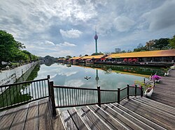 Colombo's geography is a mix of land and water. The city has many canals and, in the heart of the city, the 65-hectare (160-acre) Beira Lake.[25] The lake is one of the most distinctive landmarks of Colombo and was used for centuries by colonists to defend the city.[25] It remains a tourist attraction, hosting regattas,[26] and theatrical events on its shores. The Northern and North-Eastern border of the city of Colombo is formed by the Kelani River, which meets the sea in a part of the city known as the Modera (mōdara in Sinhala) which means river delta.
