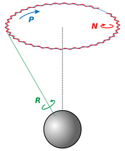 Nutation (from la nūtātiō 'nodding, swaying') is a rocking, swaying, or nodding motion in the axis of rotation of a largely axially symmetric object, such as a gyroscope, planet, or bullet in flight, or as an intended behaviour of a mechanism. In an appropriate reference frame it can be defined as a change in the second Euler angle. If it is not caused by forces external to the body, it is called free nutation or Euler nutation.[1] A pure nutation is a movement of a rotational axis such that the first Euler angle is constant. Therefore it can be seen that the circular red arrow in the diagram indicates the combined effects of precession and nutation, while nutation in the absence of precession would only change the tilt from vertical (second Euler angle). However, in spacecraft dynamics, precession (a change in the first Euler angle) is sometimes referred to as nutation.[2]